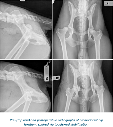 The outcome following toggle-rod stabilisation is excellent in most cases. Animals will develop a degree of osteoarthritis following any traumatic injury to a joint including hip luxation and, as such, life-long strategies to manage this will be important (weight control, exercise moderation, medical management).
